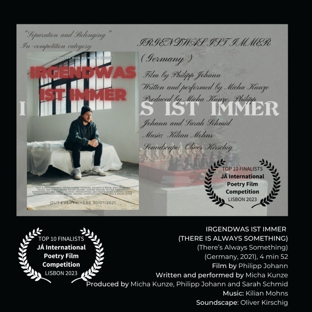“There’s Always Something” is a personal poem about depression. About getting lost in one’s own mind and being disconnected from the self. Not coming to conclusions but trying to fight without drowning in pain. It’s like an inventory of the feelings of a person who just hit rock bottom – and doesn’t even know it yet. Philipp Johann is part of the creative production company Sallyhateswing and is currently based in Cologne. He works as a director for a variety of creative films. His work varies from commercial productions all over the globe to small independent projects. Micha Kunze is a German filmmaker, spoken word poet and writer. After several tours in 2018 and 2019 through Germany, Austria and Switzerland he started producing poetry films for his own poems. He’s currently based in Cologne.